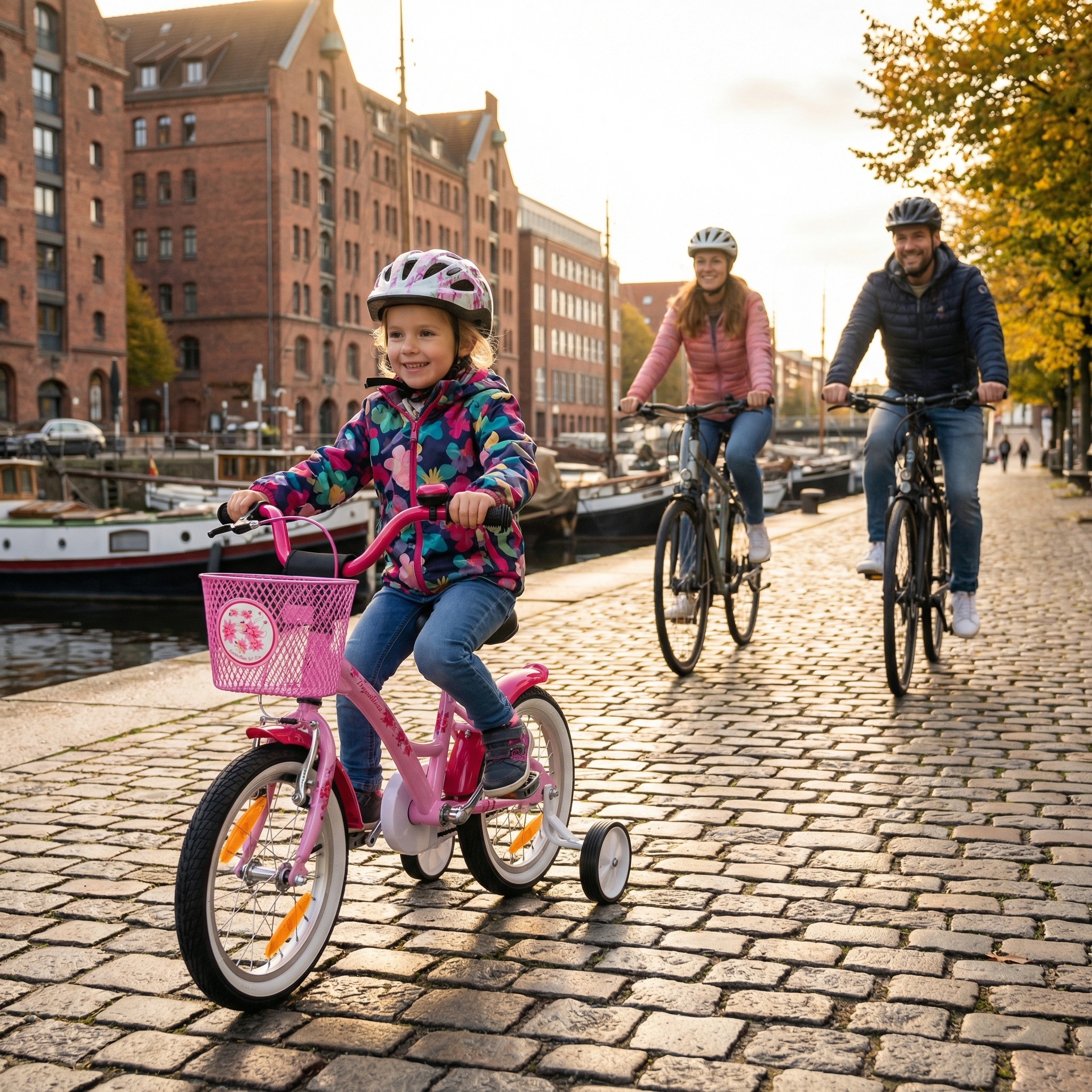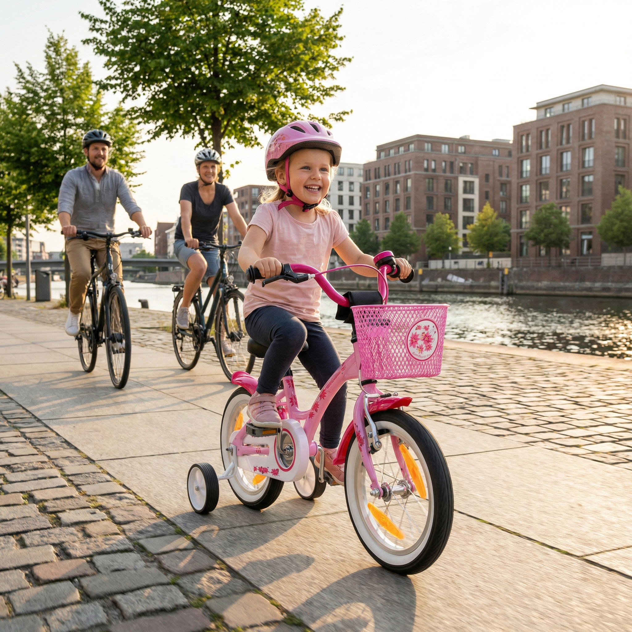 Kettenschutz, Schutzblechen, abnehmbaren Stützrädern und extra großen Reflektoren rund um das Kinderrad.